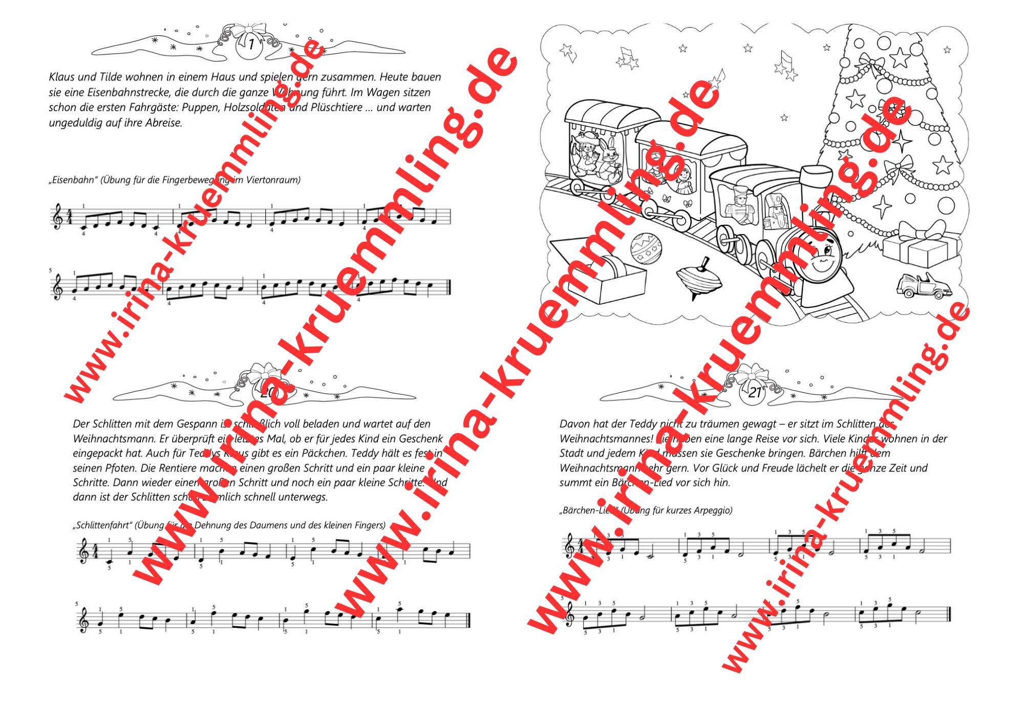 Klavier-Adventskalender „Die Winterabenteuer des Teddybären“ – eine vorweihnachtliche Ergänzung des allgemeinen Klavier-Unterrichts für Kinder im Grundschulalter mit spannender Adventsgeschichte des kleinen Teddybären zum Vorlesen, Vorspielen, Basteln, Malen, ergänzt durch einige Ideen zur Darstellung im Haustheater. Das Buch regt zum täglichen Musizieren an und begleitet die Kinder auf unterhaltsame Weise durch die Adventszeit bis zum Weihnachtsfest.